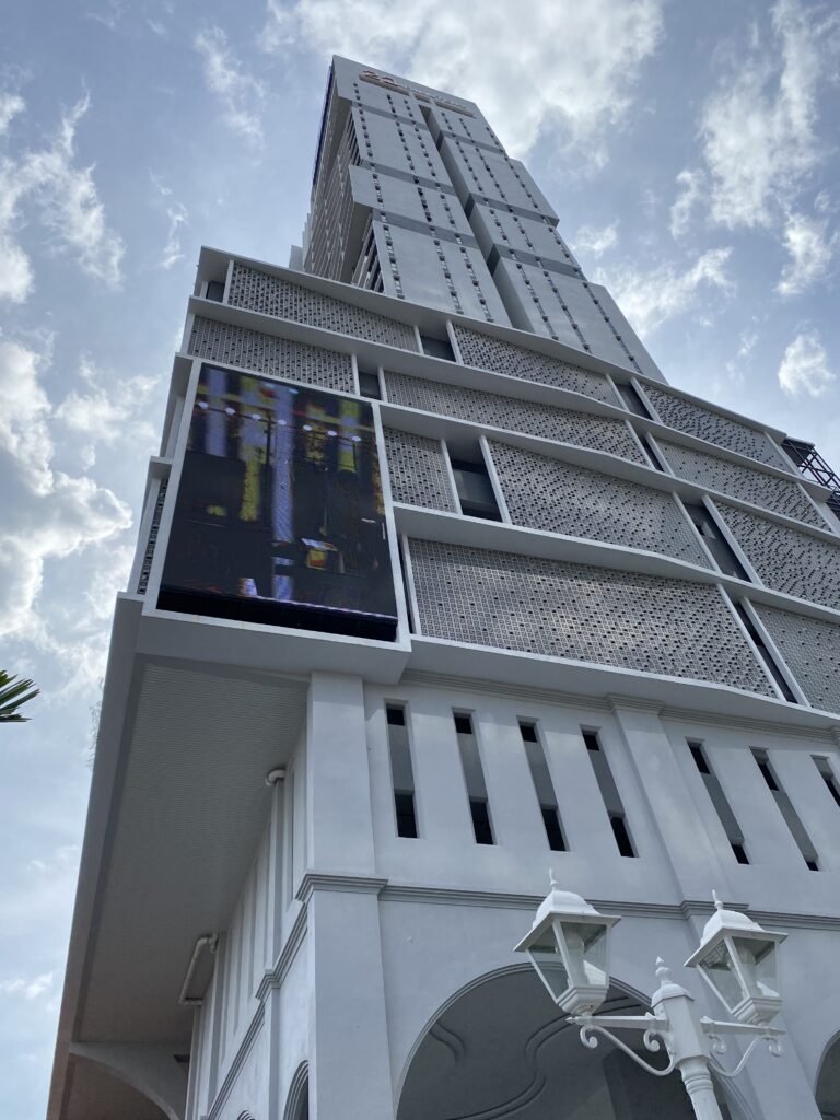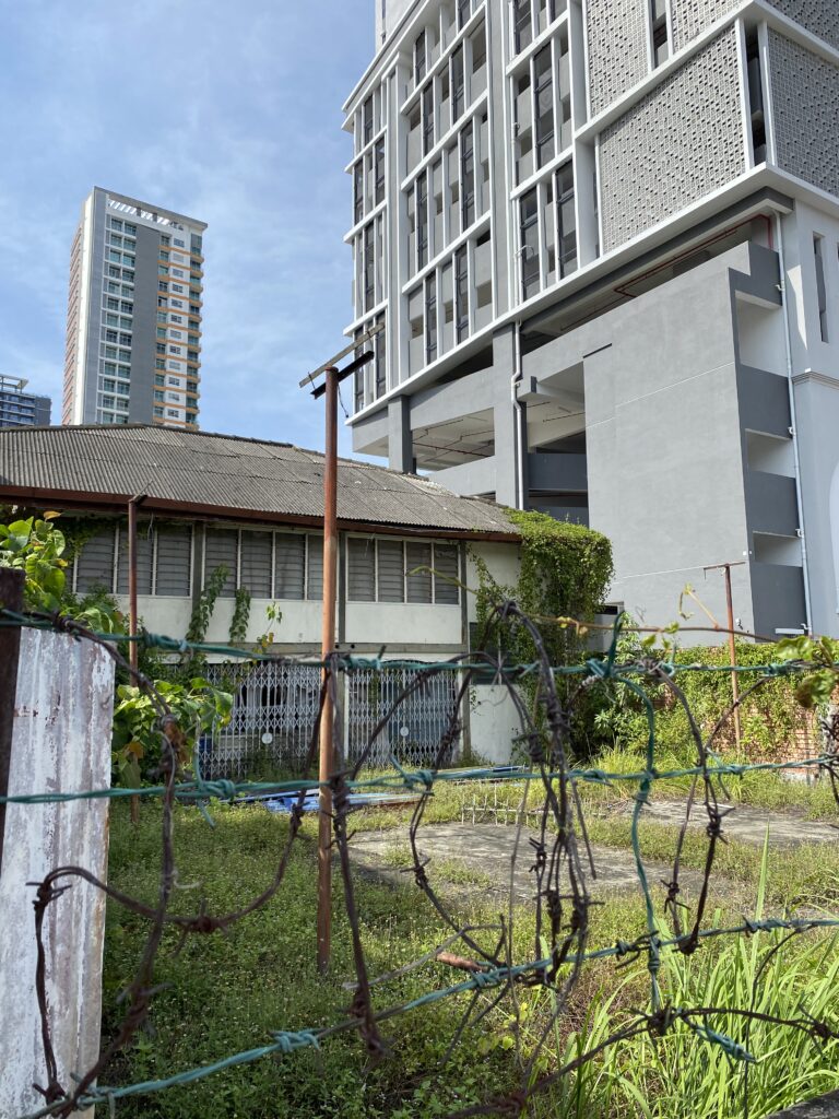Across the road, the skyline stacks up with familiar landmarks: Courtyard by Marriott Penang and Tropicana 218 Macalister standing tall, while just opposite, the low-rise, orange-tinted bungalow quietly tells a much older story.