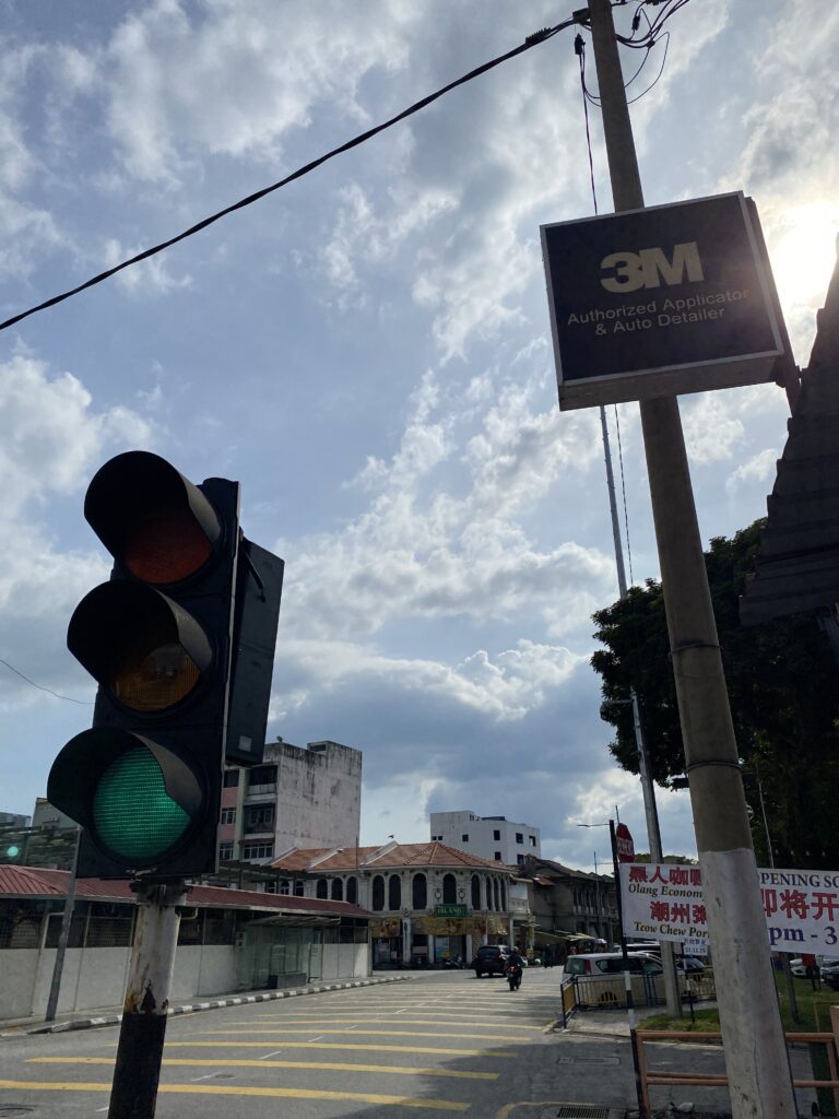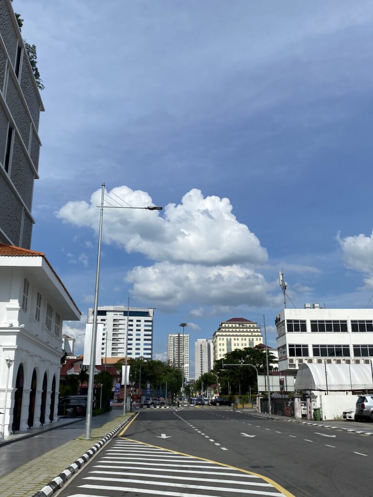 Just off Macalister Road, Anson Road peels away, calmer but no less characterful. Above it all, the sky stretches wide—bright blue, washed clean, with soft, cottony clouds drifting lazily overhead.