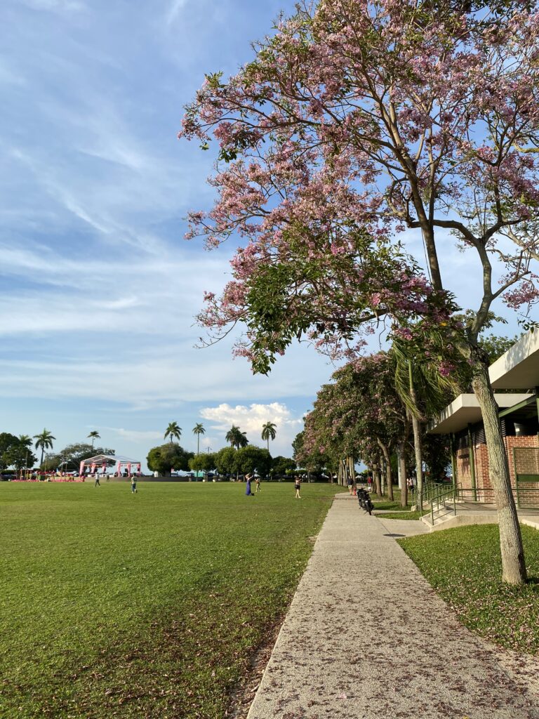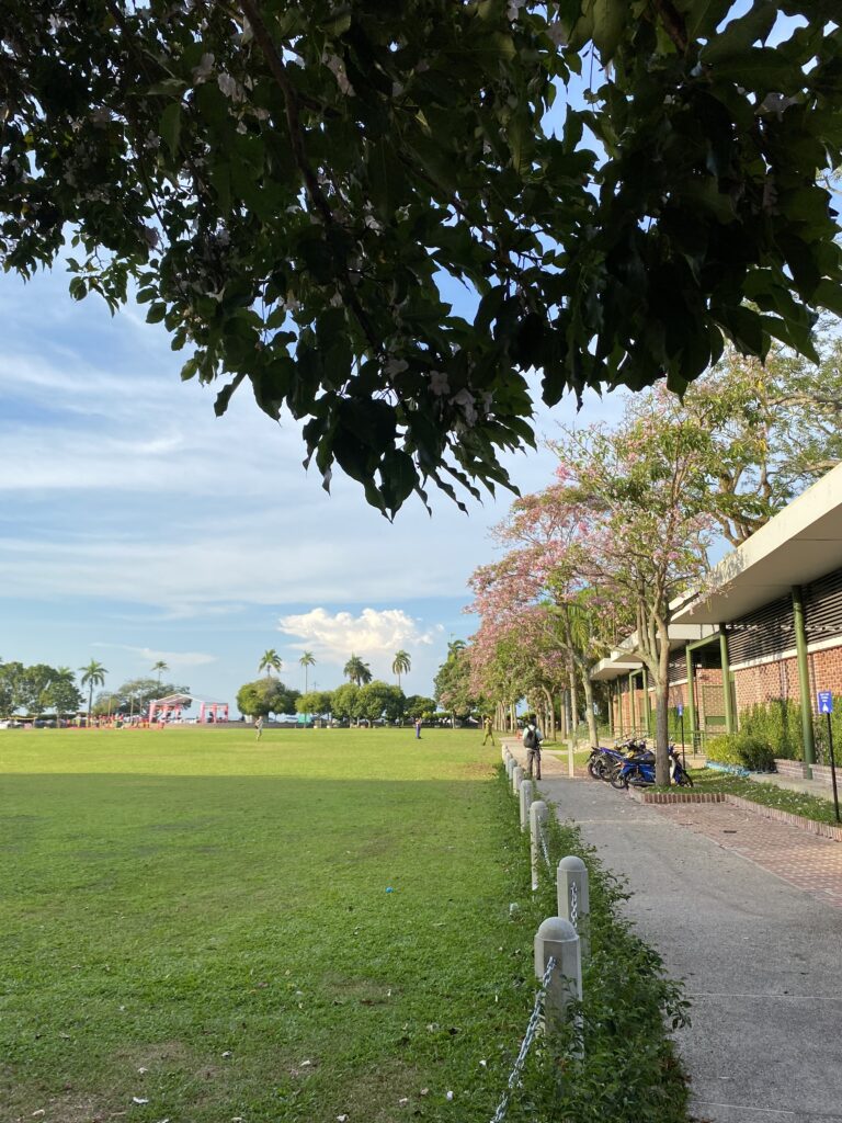 Sakura trees are usually associated with cooler climates, yet here they stand in tropical Penang, blooming gracefully under the warm sun. The contrast is striking — pink blossoms against the deep blue Penang sky.