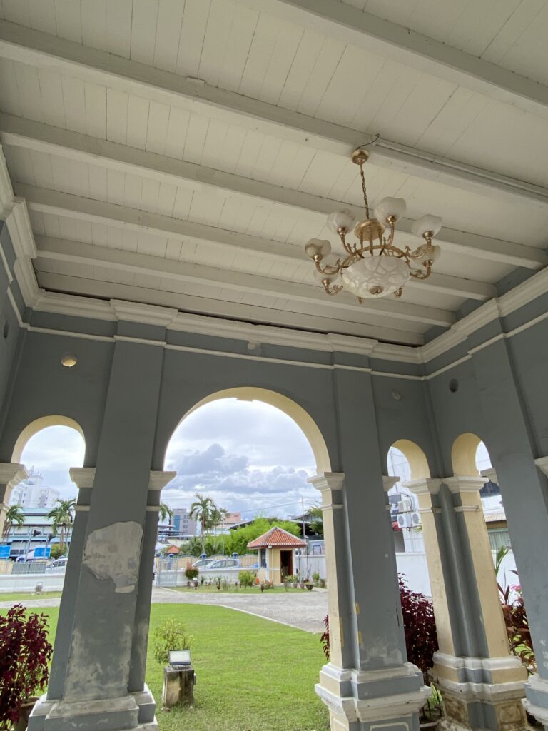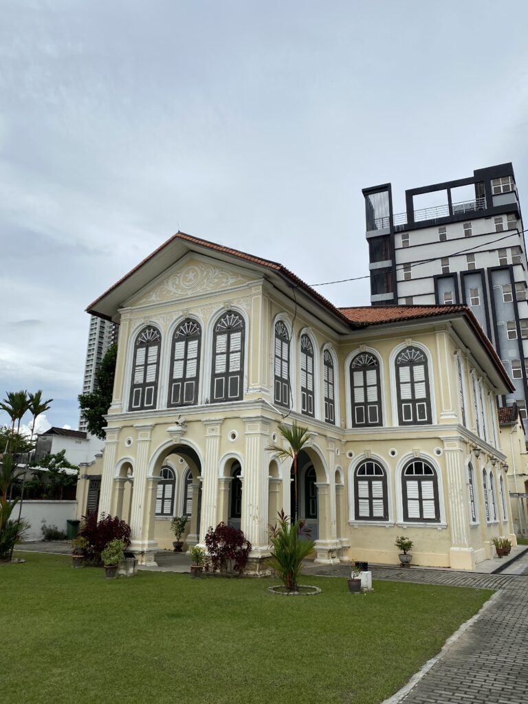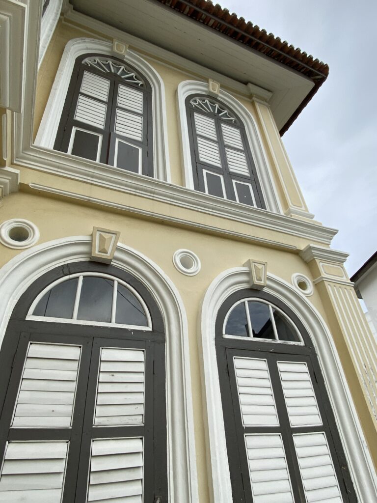Nestled behind a manicured lawn, Penang Malay Gallery draws the eye with its graceful, almost nostalgic presence. The building is a fine example of Straits Eclectic architecture, where European symmetry meets local sensibilities. Its pale cream façade is softened by elegant arches, fluted columns, and tall timber windows fitted with decorative fanlights.