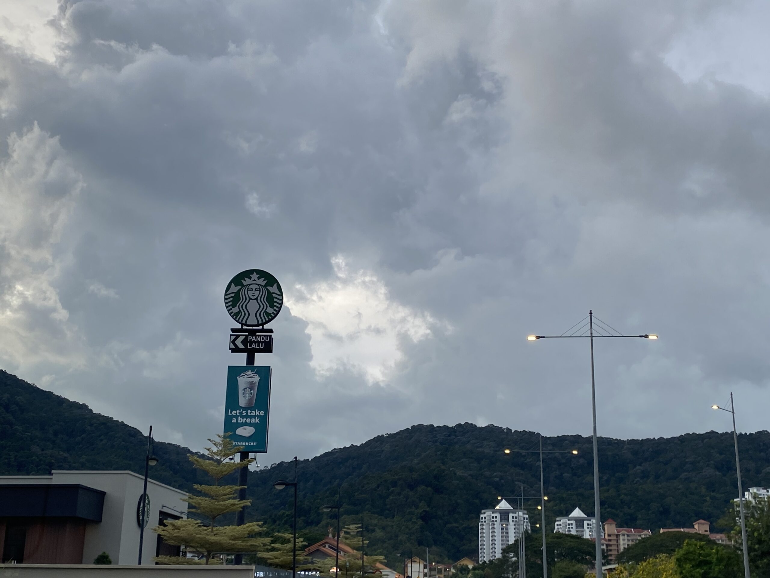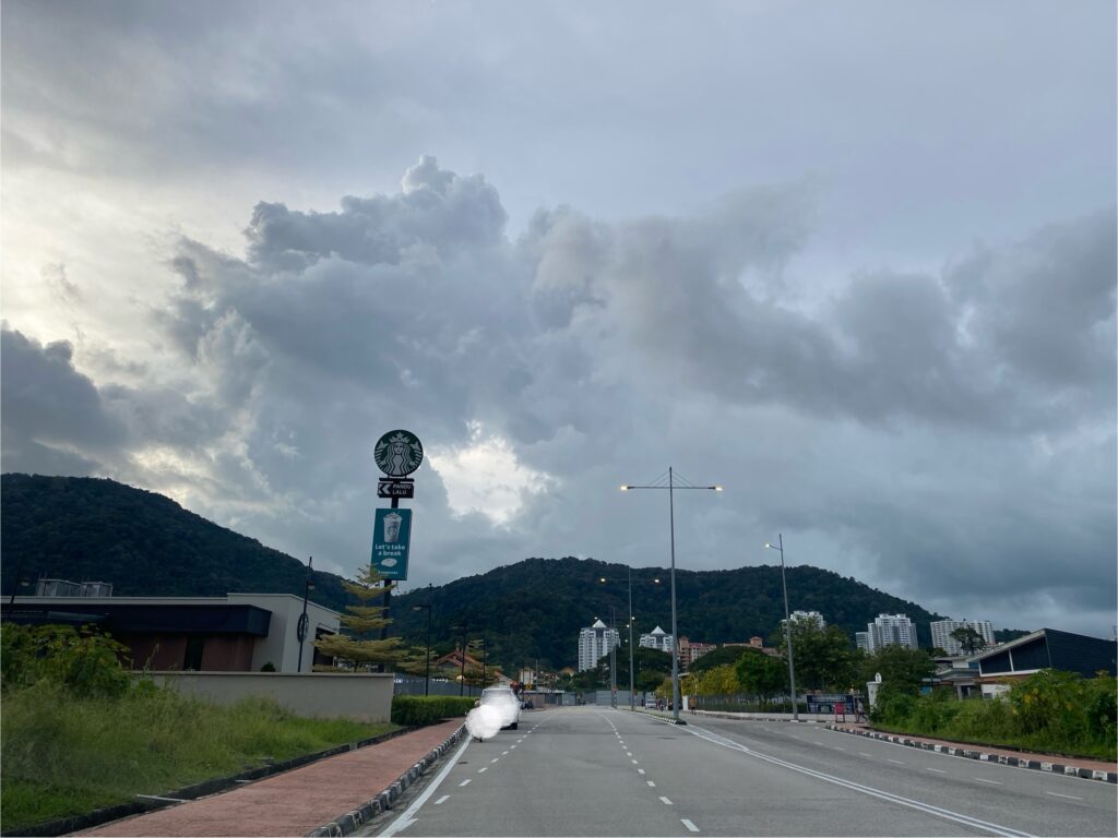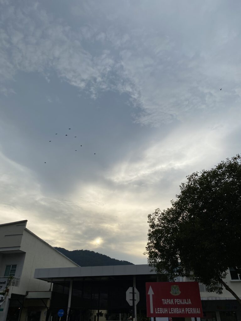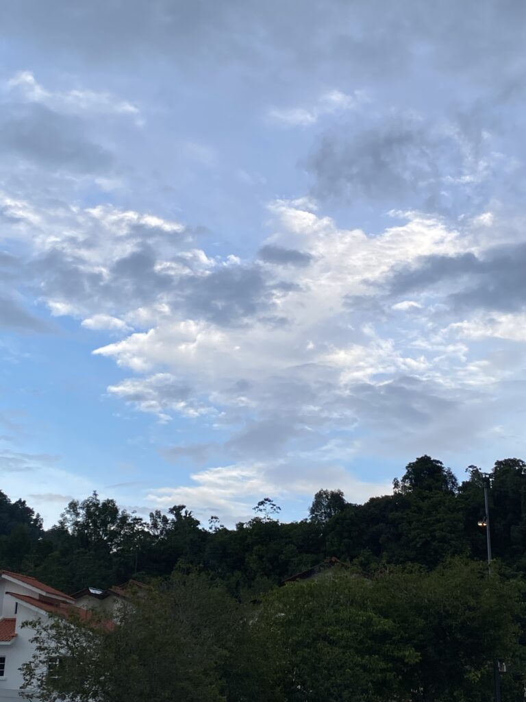 Just above the quiet rooftops and the green hillside, the sky loosens into soft patches of blue — like a curtain being slowly drawn apart. Wisps of clouds drift freely, their edges fading into the light, letting bits of sunshine peek through. They aren’t in a hurry. They don’t rush to form a shape or tell a story. Instead, they float as if they’re just enjoying the evening breeze over Penang, letting nature take its time.