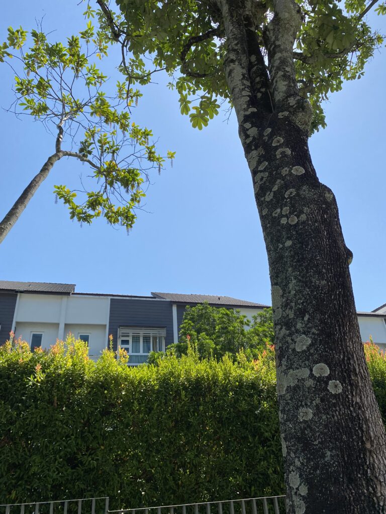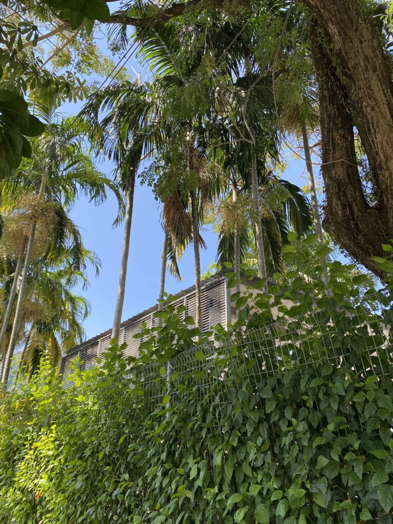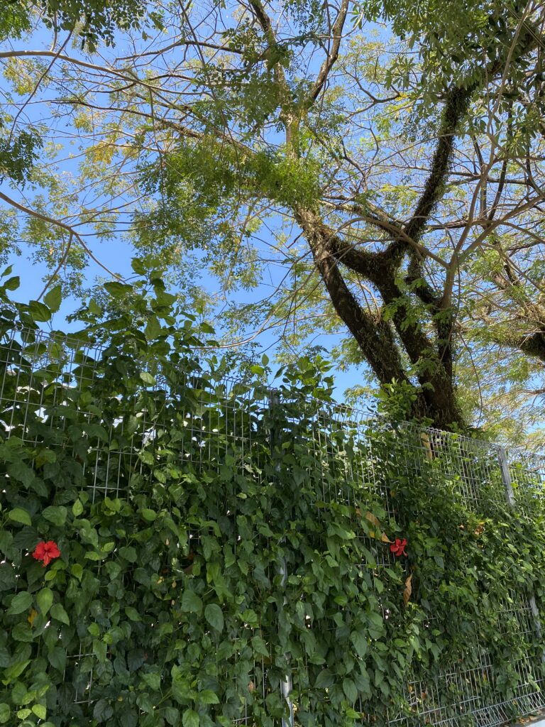 One of the first things you notice around the school is the mature greenery — tall palms, large shade trees and fences softened by climbing plants and flowering vines. In places, hibiscus blooms peek through wire fences, while sunlight filters gently through wide canopies above.