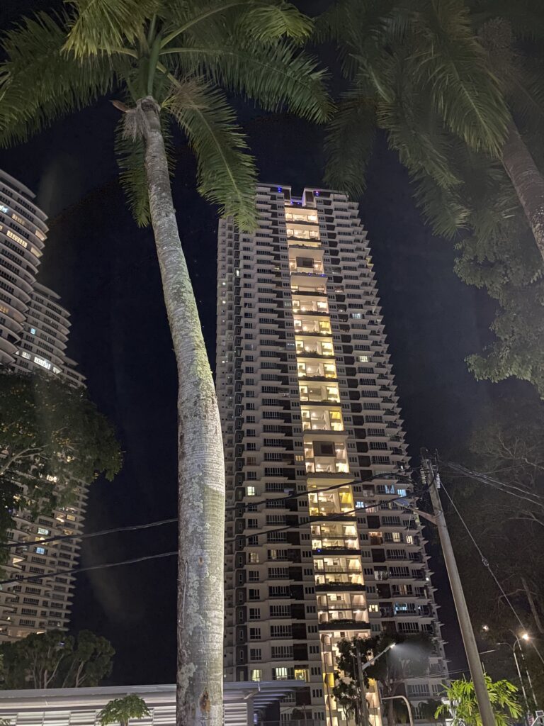 Yet nothing prepares us for Penang at night. The same trees, the same leaves, the same branches — and somehow, they appear completely different. In the photo below, the tall building glows softly behind the silhouettes of the darkened trees. The branches twist like quiet shadows, the leaves become a soft veil, and the atmosphere changes into something calmer, gentler, almost sentimental. Nighttime Penang feels deeper, more emotional — a reminder that even familiar things can transform when the light changes.